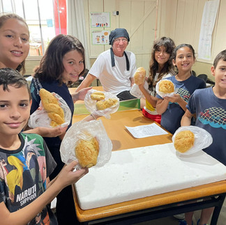 Atividades e Vivências:Os participantes prepararam uma massa simples de pão, aprenderam técnicas básicas de modelagem, além de orientações essenciais sobre uso do forno e segurança alimentar, vivenciando o trabalho em equipe e a importância do cuidado em cada etapa do processo.