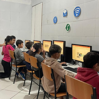 A atividade começou com a dinâmica do equilíbrio, utilizando tampinhas e rolinhos de papel higiênico, estimulando concentração e coordenação. Em seguida, na sala de informática, os alunos aprenderam a inserir e ajustar imagens nos slides, trabalhando com posicionamento (frente e trás) e organização visual.