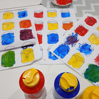 Atividade: Pintura e mistura das cores primárias (vermelho, azul e amarelo) para descobrir as cores secundárias (laranja, verde e roxo).