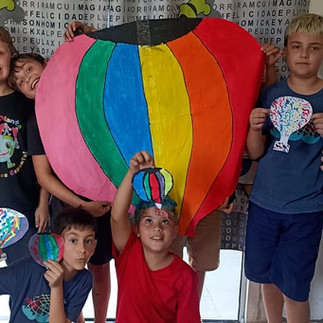 🖌️ Atividade do dia As crianças pintaram balões de ar quente com tinta guache, preparando uma decoração cheia de cor e imaginação para nossa ação educativa.