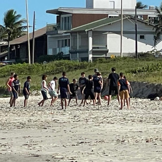 🎯 Atividades: Momento de jogos na praia, trabalhando o autogoverno e a convivência, seguido da criação de slides com notícias sobre violência virtual contra a mulher.