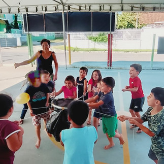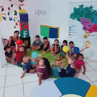 🎈 Atividade: Com bexigas coloridas representando os tipos de lixo, as crianças participaram de uma dinâmica em equipe: utilizando barbantes presos a um bambolê com saco de lixo, precisavam conduzir as bexigas até o alvo, dizendo qual tipo de lixo cada cor representava ♻️. Uma forma divertida e colaborativa de aprender!