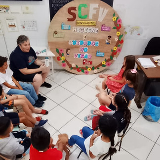 Objetivo: Refletir sobre a importância da higiene diária e dos cuidados essenciais no verão: lavar as mãos, escovar os dentes, usar antitranspirante, aplicar protetor solar, hidratar a pele e manter cabelos e unhas limpos. Por meio da demonstração prática, as crianças puderam observar a maneira correta de utilizar o protetor solar.